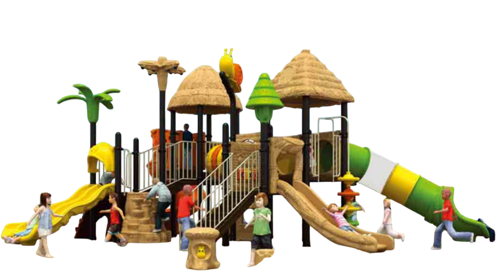 Пластиковые компоненты: включая волнообразные и прямые горки, закрытую трубчатую горку, декоративные элементы в виде деревьев и природных форм — изготовлены из нетоксичного инженерного пластика с UV-защитой, окрашены в массе, не выгорают и не трескаются; поверхность — гладкая, края — скруглённые, исключают острые выступы и снижают риск травм.