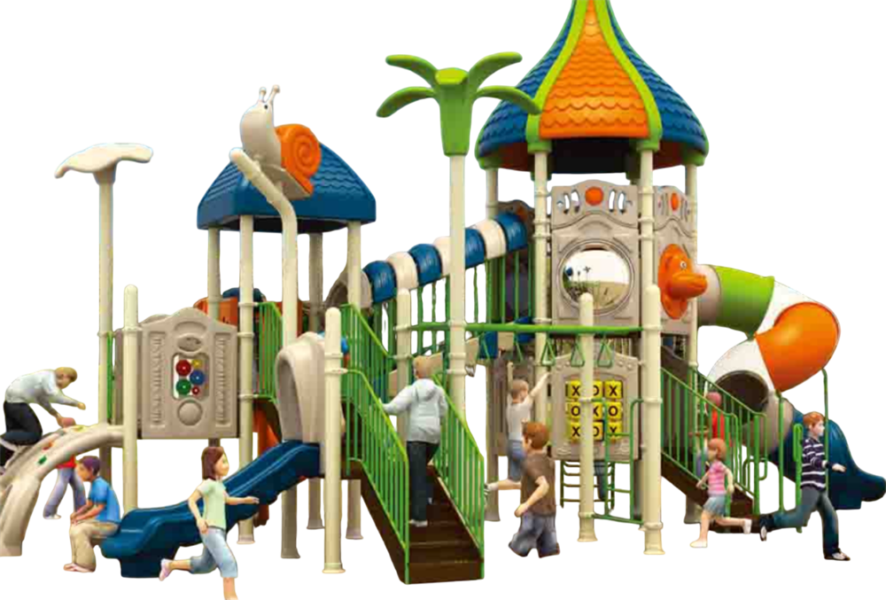 Пластиковые модули: комбинированные спуски (открытые и закрытые трубчатые), интерактивные панели (крестики-нолики, тактильные элементы), обзорное окно («зеркало»), тематические навесы и переходы — изготовлены из нетоксичного инженерного пластика с UV-защитой, окрашены в массе, не выгорают и не трескаются; все поверхности — гладкие, края — скруглённые, что минимизирует риск травм.