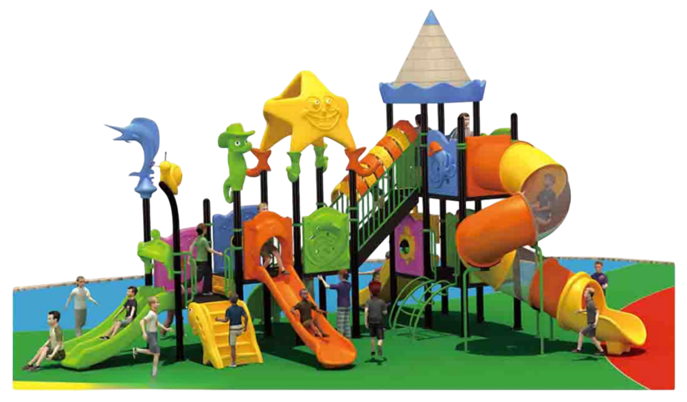 Пластиковые игровые модули: тематические декоры в морском стиле (звезда, дельфин и другие акценты), открытые и закрытые скаты, панорамные вставки в трубчатой горке, развивающие панели — выполнены из нетоксичного инженерного пластика с UV-защитой, окрашены в массе, не выгорают и не трескаются; гладкие поверхности и скруглённые края минимизируют травматизм.