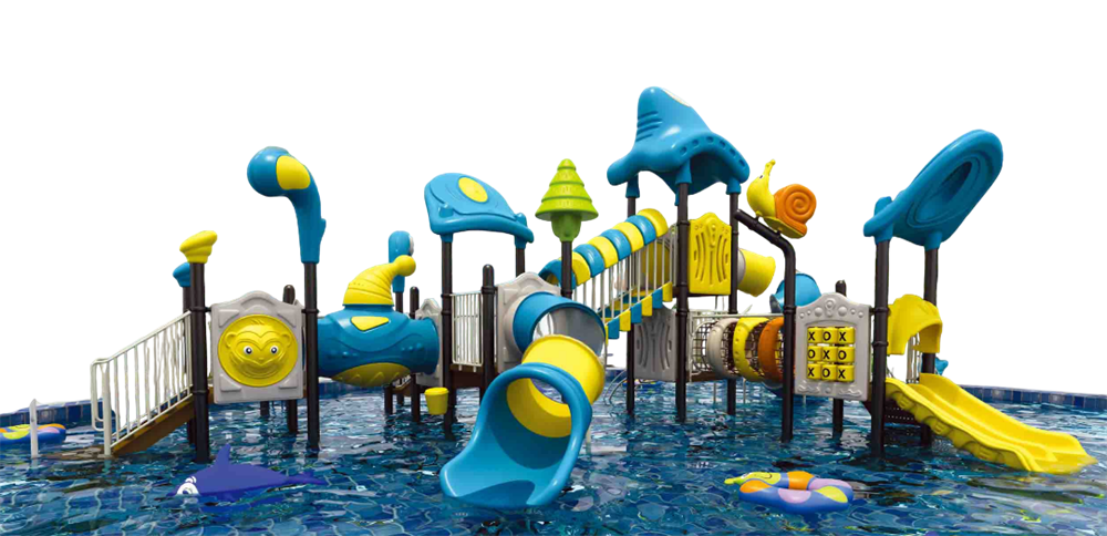 Комплектация: несколько горок (винтовые, прямые, тоннельные), мосты, лестницы, водные фонтаны и декоративные элементы в виде цветов и животных.