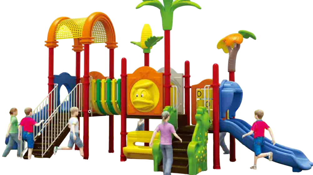 Пластиковые модули: два спуска (волнообразный и прямой), соединительный мягкий тоннель, тематические панели (например, крестики-нолики и декоративные элементы в виде пальм), навесы и ограждения — выполнены из нетоксичного инженерного пластика с UV-защитой, окрашены в массе, не выгорают и не трескаются; гладкие поверхности и скруглённые края исключают острые выступы.