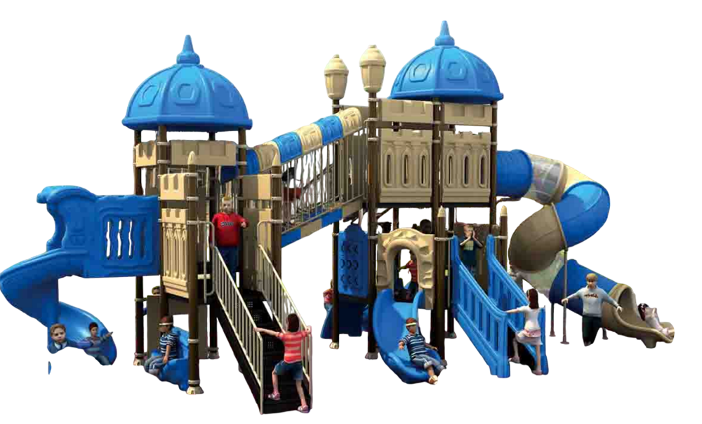 Компактную, многоуровневую игровую зону с сочетанием туннельной и открытой горок.