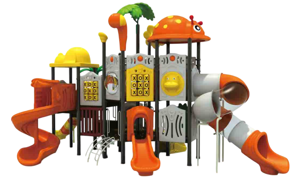 Пластиковые модули: включая закрытую трубчатую горку, открытые горки, тематические панели (например, крестики-нолики), декоративные элементы и обзорные окна — изготовлены из нетоксичного инженерного пластика с UV-защитой, окрашены в массе, не выгорают и не трескаются; поверхности — гладкие, края — скруглённые — исключены острые выступы и минимизирован риск травм.