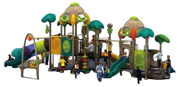 Пластиковые компоненты: горки (в том числе закрытые и волнообразные), туннели, тематические навесы в виде «лисий» или природных куполов, интерактивные панели и лазательные элементы — изготовлены из нетоксичного инженерного пластика с UV-защитой, окрашены в массе, не выгорают и не трескаются; поверхности — гладкие, края — скруглённые, что минимизирует риск травм.