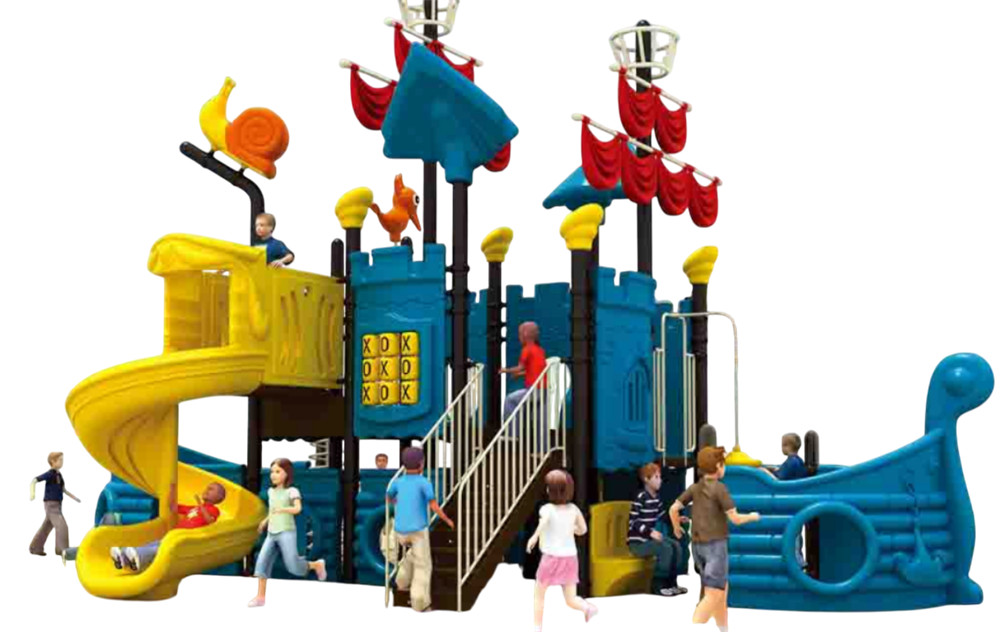 Пластиковые игровые модули: спиральная горка, сюжетные элементы «корабля» и «крепости», обзорные окна, тематические панели (крестики-нолики), мягко оформленные переходы — выполнены из нетоксичного инженерного пластика с UV-защитой, окрашены в массе, не выгорают и не трескаются; скруглённые края и гладкие поверхности минимизируют риск травм.