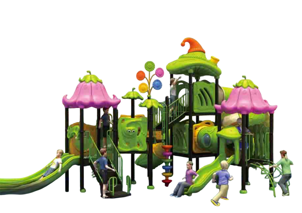 Пластиковые компоненты: разнообразные горки (прямые и легкие волнообразные), закрытые и открытые спуски, тематические навесы, интерактивные панели и декоративные элементы — выполнены из нетоксичного инженерного пластика с UV-защитой, окрашены в массе, не выгорают и не трескаются; поверхности — гладкие, края — скруглённые, что исключает острые выступы.