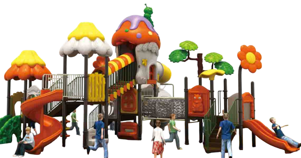 Пластиковые элементы: тематические навесы в форме грибов и природных мотивов, закрытые туннели, волнообразные и прямые спуски, интерактивные панели и обзорные окна — выполнены из нетоксичного импортного инженерного пластика с UV-защитой, окрашены в массе, не выгорают и не трескаются; поверхности — гладкие, края — скруглённые, что минимизирует риск травм.