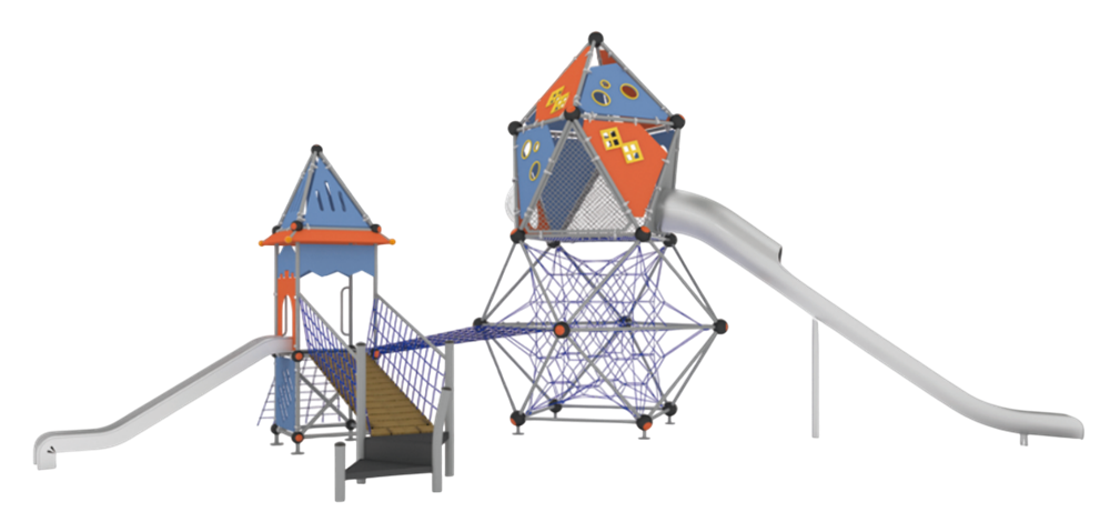 Все платформы и лестницы изготовлены из холодноформованной стали с антикоррозийной обработкой и мягким буферным покрытием — устойчивая и безопасная поверхность для игр.