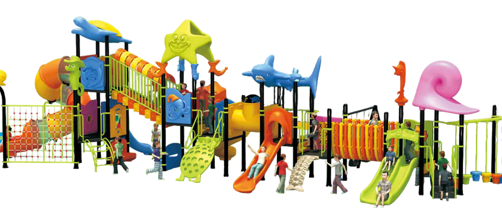 Пластиковые компоненты: разнообразные горки (прямые, волнообразные, трубчатые и комбинированные), тематические навесы, туннели, сеточные лазалки и игровые панели (например, крестики-нолики) — выполнены из нетоксичного инженерного пластика с UV-защитой, окрашены в массе, не выгорают и не трескаются; поверхности — гладкие, края — скруглённые, что минимизирует риск травм.