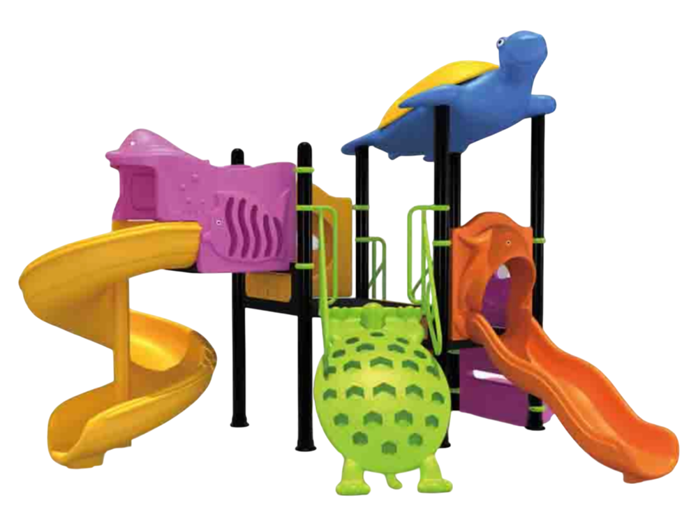 Пластиковые элементы: горки (волнообразная и прямой спуск), тематические панели и крышки выполнены из нетоксичного инженерного пластика с UV-защитой, окрашены в массе, не выгорают и не трескаются; поверхность — гладкая, края — скруглённые для минимального риска травм.