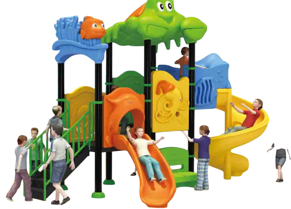 Пластиковые компоненты: тематические панели, волнообразные и прямые спуски, декоративные элементы в виде морских фигур — выполнены из нетоксичного инженерного пластика с UV-защитой, окрашены в массе, не выгорают и не трескаются; гладкие поверхности и скруглённые края минимизируют риск травм.