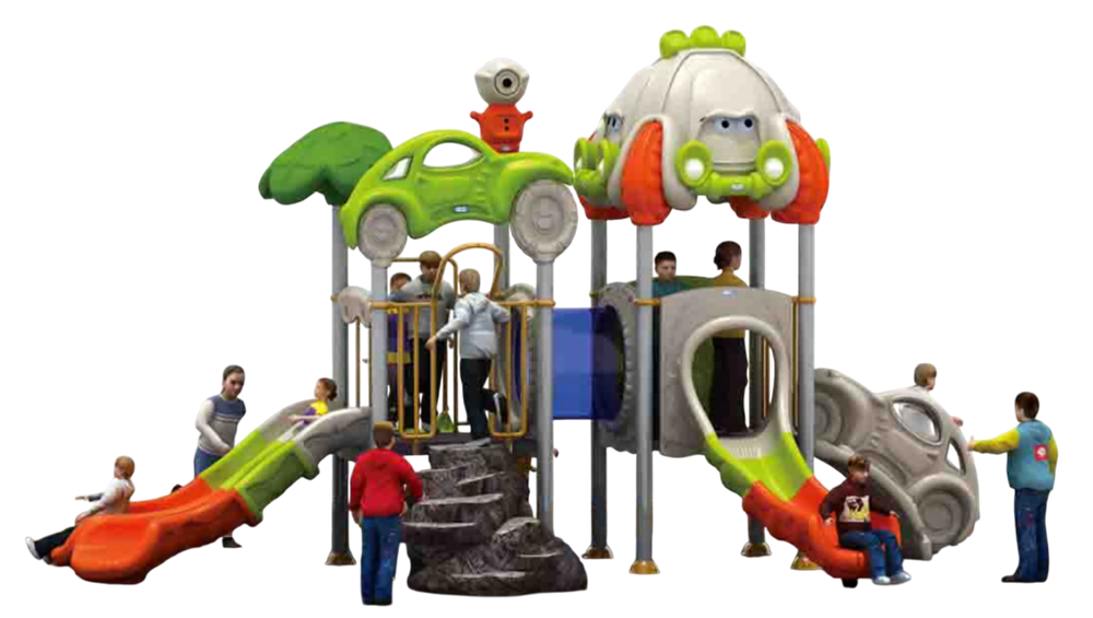 Пластиковые компоненты: включают тематические элементы в виде машин, закрытый тоннель, комбинированные спуски и стилизованные элементы лазания — выполнены из нетоксичного инженерного пластика с UV-защитой, окрашены в массе, не выгорают и не трескаются; поверхности — гладкие, края — скруглённые для снижения риска травм.