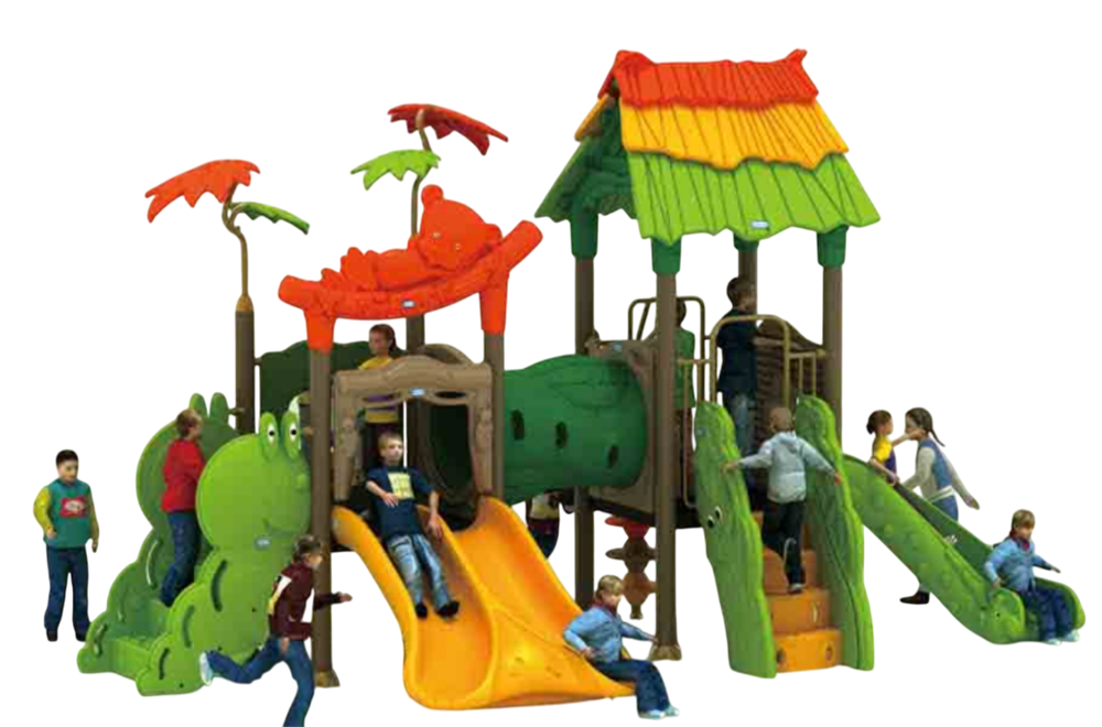 Пластиковые компоненты: в том числе горки, тоннель и декоративные элементы в форме листьев и причудливых форм — изготовлены из нетоксичного инженерного пластика с UV-защитой, окрашены в массе, не выгорают и не трескаются; поверхность — гладкая, края — скруглённые, что исключает острые выступы.