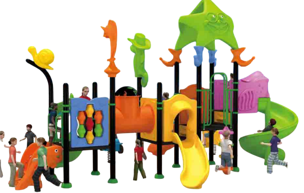 Пластиковые компоненты: включая закрытый тоннель, волнообразные и прямые горки, тематические панели (в том числе шестигранный интерактивный элемент), декоративные фигуры в виде звезды, морского конька и улитки — выполнены из нетоксичного инженерного пластика с UV-защитой, окрашены в массе, не выгорают и не трескаются; поверхности — гладкие, края — скруглённые, что минимизирует риск травм.