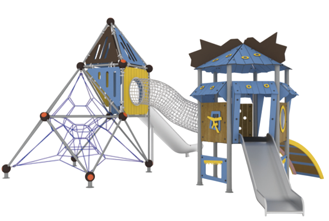 Комплекс включает в себя башни, мостики, горки, лазалки, тоннели, домики, сетки и игровые панели — полноценная игровая экосистема.