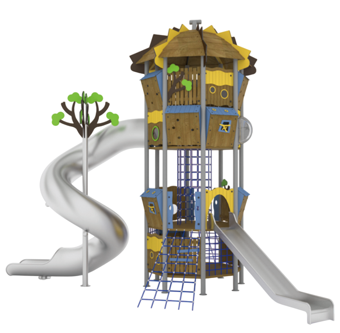 Платформы и лестничные элементы комплекса выполнены из холодноформованной стали с антикоррозийной обработкой и мягким буферным покрытием. Это защищает металл от ржавчины и создаёт комфорт для детей при контакте.