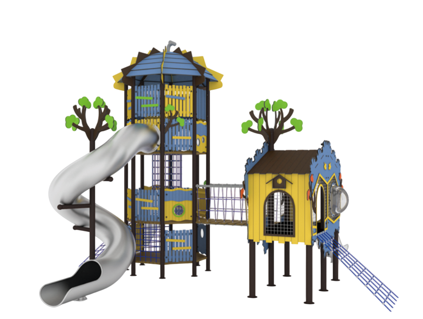 Многоуровневая структура с башнями, мостами, сетками, горками, переходами и тематическими зонами.