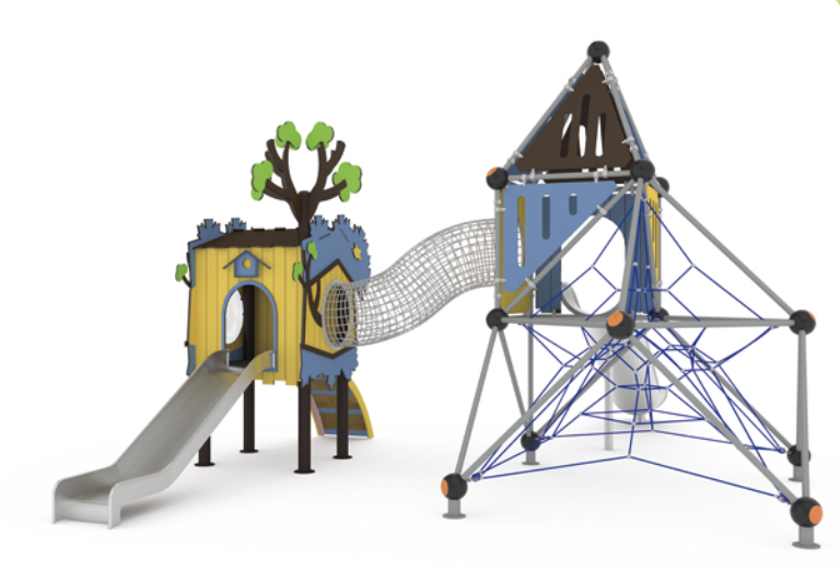 Многоуровневая структура с башнями, мостами, сетками, горками, переходами и тематическими зонами.