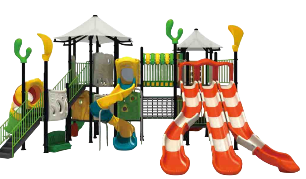 Пластиковые элементы: три параллельные волнообразные горки, спиральный закрытый спуск, обзорные окна, тематические панели и крыши защищают от солнца — все из нетоксичного инженерного пластика с UV-защитой, окрашены в массе, не выгорают и не трескаются; поверхности — гладкие, края — скруглённые.