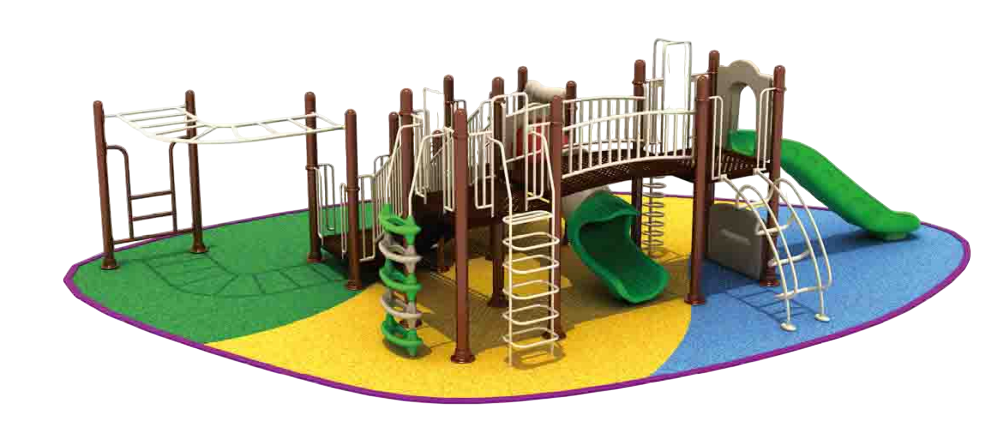 Платформы и переходы: широкие и низкие соединительные мостики обеспечивают удобное, безопасное перемещение детей без резких перепадов высоты; все металлические конструкции проходят антикоррозийную обработку (оцинковка, электростатическое напыление) и покрыты порошковым покрытием для защиты от внешних воздействий.