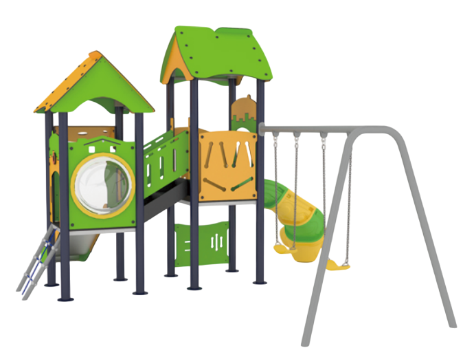 Пластиковые элементы горки и сидений: изготавливаются из безопасного инженерного пластика LLDPE методом ротационного формования; окрашены в массе, не трескаются, не выгорают и сохраняют прочность.