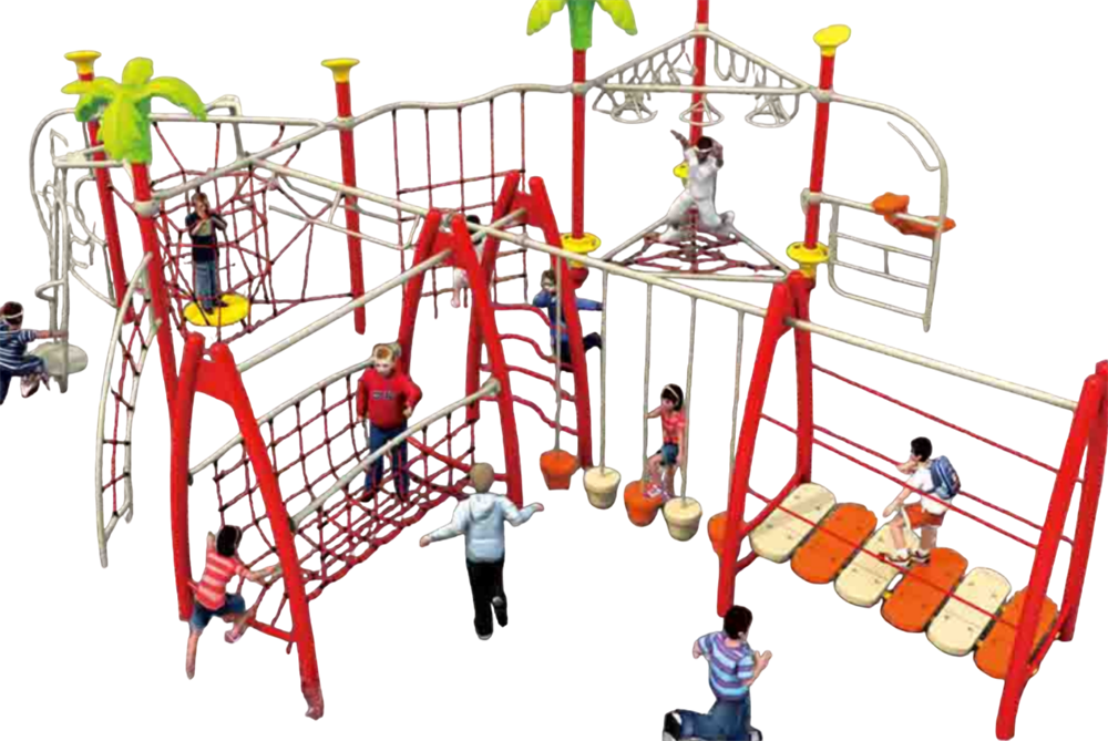 Элементы комплекса: вертикальные и наклонные сетки, подвесные канатные мосты, рукоход, кольцевые лазательные элементы, платформы, качающиеся опоры, переходы по верёвкам, верёвочные башни.