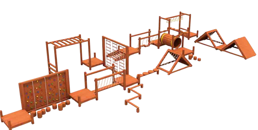 Элементы комплекса: скалодром, подвесные и канатные мосты, туннель-барабан, балансиры, рукоход, сетки для лазания, наклонные подъёмы и спуски.