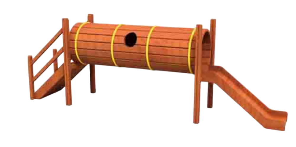 Тоннель выполнен из продольных ламелей, скреплённых внешними кольцами — прочная и безопасная конструкция с дополнительным лазом для игры.