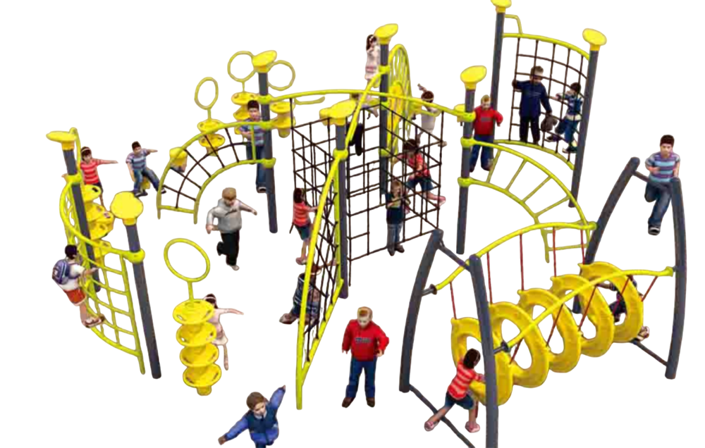 Элементы комплекса: вертикальные и наклонные сетки, рукоходы, дугообразные лазательные конструкции, спиральные подъёмы, кольцевые переходы, туннель из подвесных элементов.
