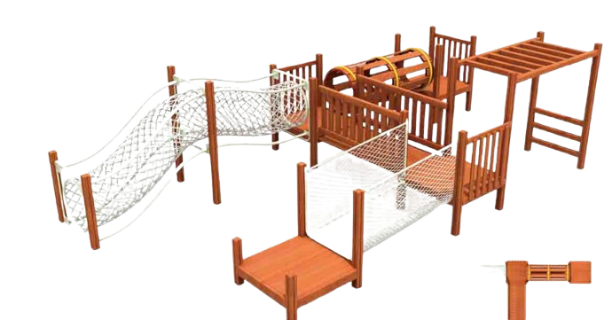 Элементы комплекса: подвесные сетчатые мосты, сетка для лазания, туннель-барабан, рукоход, зоны для балансировки.