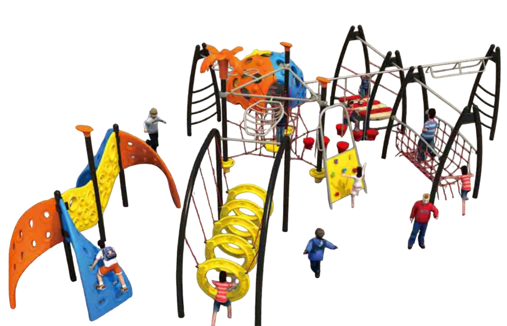 Элементы комплекса: лазательные панели, кольцевые туннели, рукоходы, сетчатые мосты, подвесные переходы, модули для скалодрома, верёвочные подъёмы и игровые платформы.