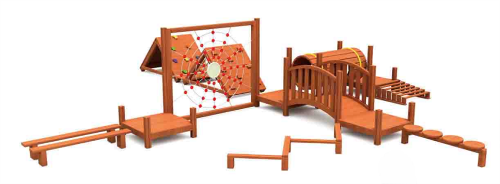 Элементы комплекса: наклонные подъёмы, канатная паутина, арочный мост, туннель-барабан, балансиры, бревенчатые переходы, лестницы для лазания.